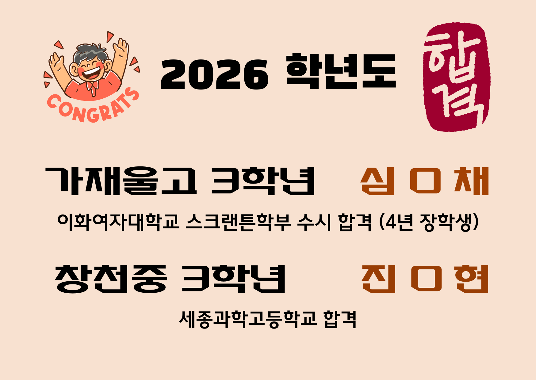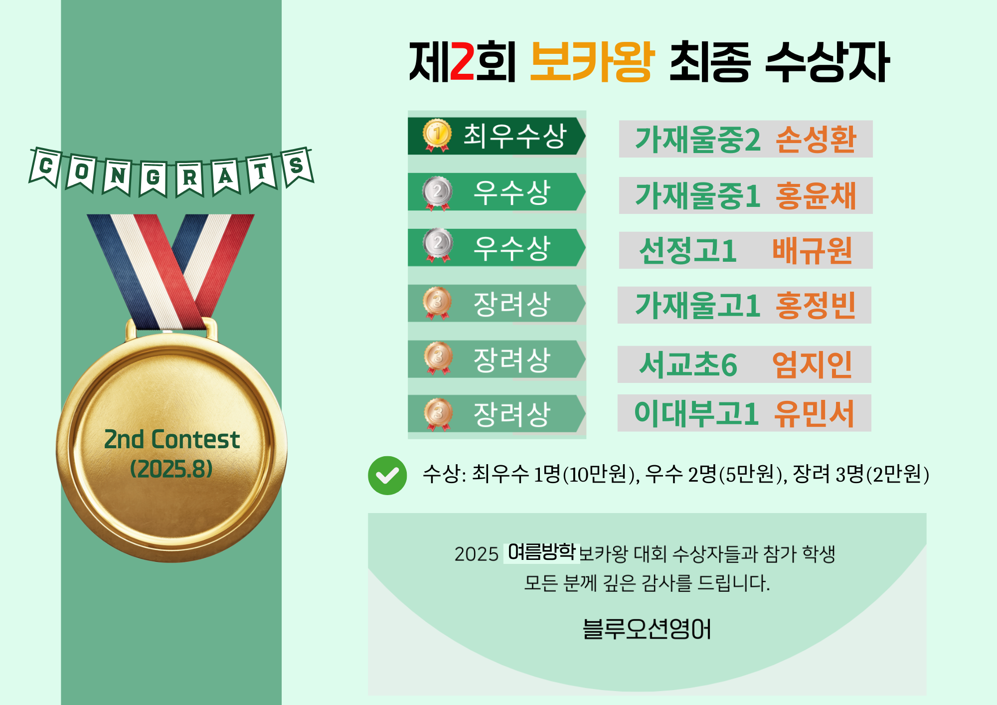 제2회 블루오션 보는 보카 암기왕 최종 수상 2025년 여름름방학 한 달(7/14~8/14) 동안 진행된 제2회 보카왕 선발 대회에서 가재울중2 손성환 학생이 최우수상을 수상하였습니다. 영어교육상담 2025.08.19