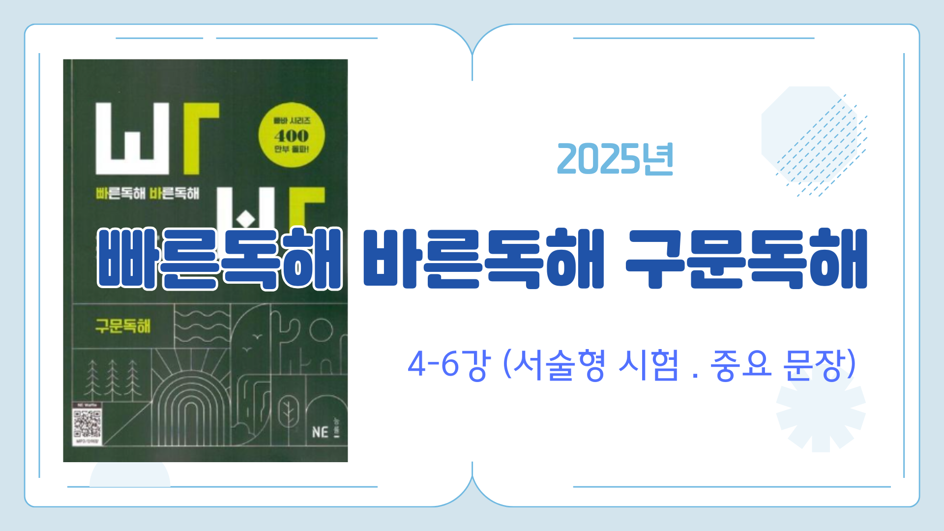 빠른독해 바른독해 구문독해 (4-6강) / 서술형 필수 문장 #빠른독해 바른독해 구문독해 #빠바 구문독해 #빠른독해 바른독해 #영어독해 기본 2025년 내신 대비 개정판, 빠른독해 바른독해 구문독해 04 보어는 불완전함을 보충한다 05 수식어는 괄호로 묶어라 06 접속사로 문장 간의 논리를 간파하라 서술형 시험 대비, 04 - 06강 정리해드립니다 https://youtu.be/Nnx5gFOULLQ 블루오션 유튜브 2025.06.11