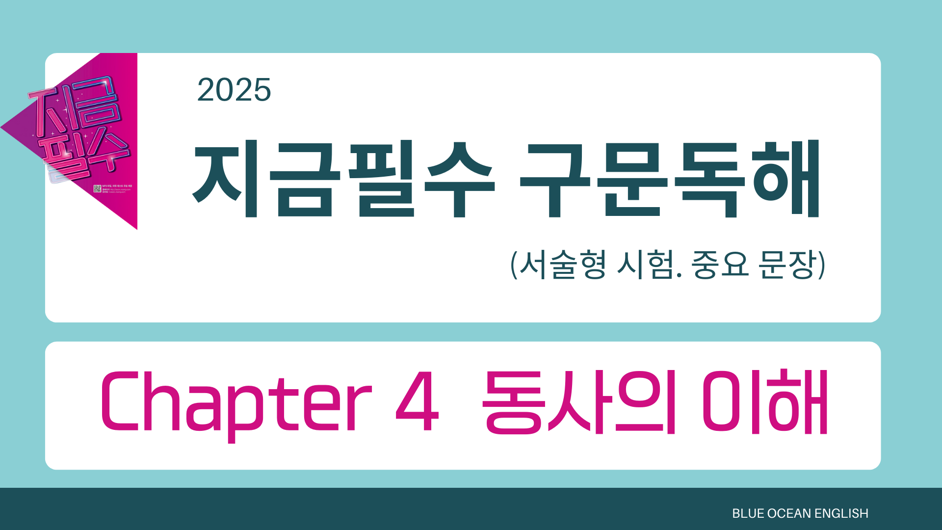 지금필수 구문독해 (Chapter 4) #지금필수 구문독해 #지금필수 영어영역 구문독해 #구문독해 #비상 구문독해 #비상 지금필수 #지금필수 2025년 내신 대비 개정판 지금필수 구문독해 Chapter 4 동사의 이해 서술형 시험 대비 핵심 문장만 선별하여 암기 시켜드립니다 https://youtu.be/q3ZZfIiaAIg 블루오션 유튜브 2025.06.11