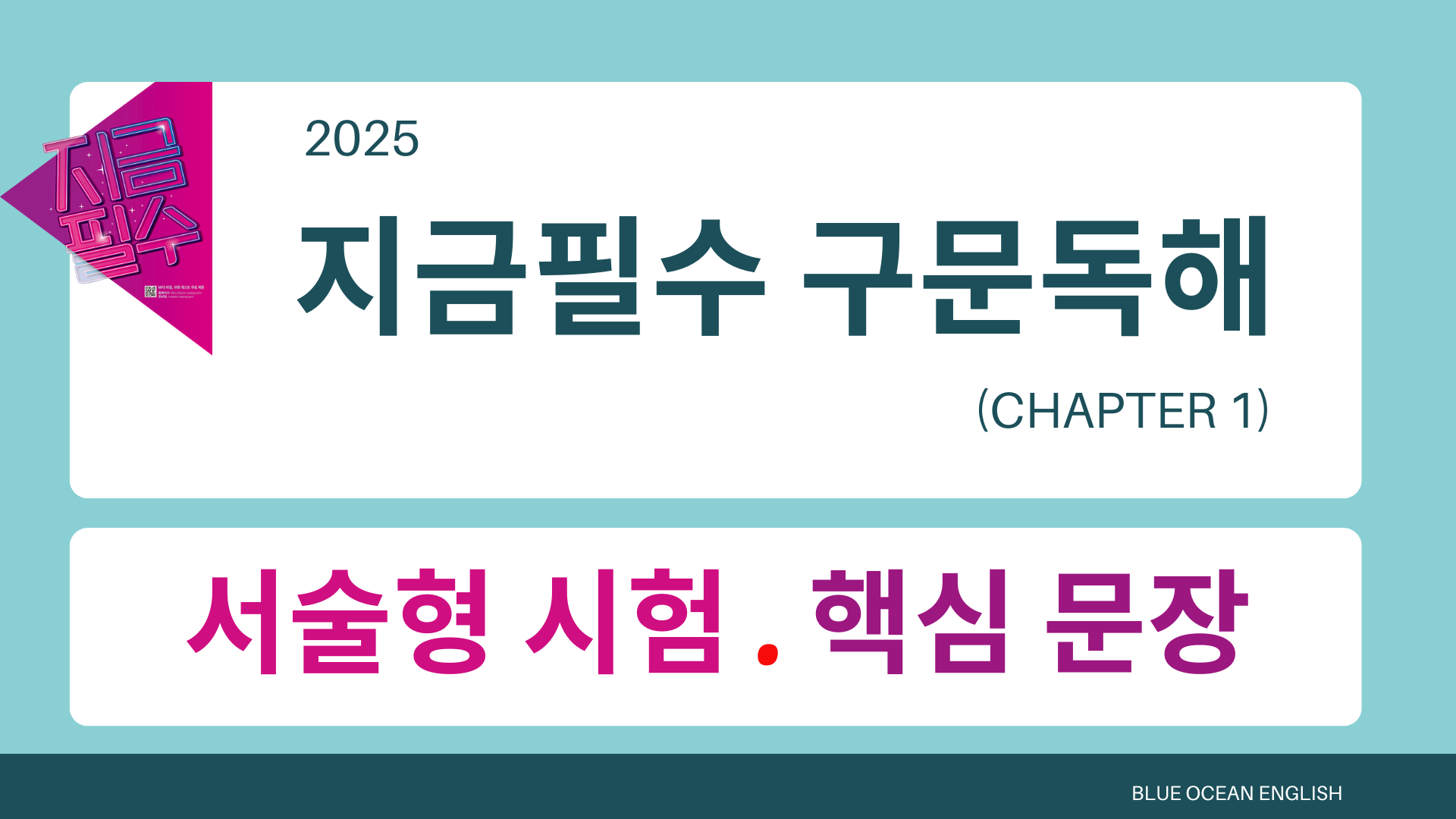 지금필수 구문독해 (Chapter 1) #지금필수 구문독해 #지금필수 영어영역 구문독해 #구문독해 #비상 구문독해 #비상 지금필수 #지금필수 2025년 내신 대비 개정판 지금필수 구문독해 Chapter 1 주어의 이해 서술형 시험 대비 핵심 문장만 선별하여 암기 시켜드립니다 https://youtu.be/bT52plTsiZI 블루오션 유튜브 2025.06.11