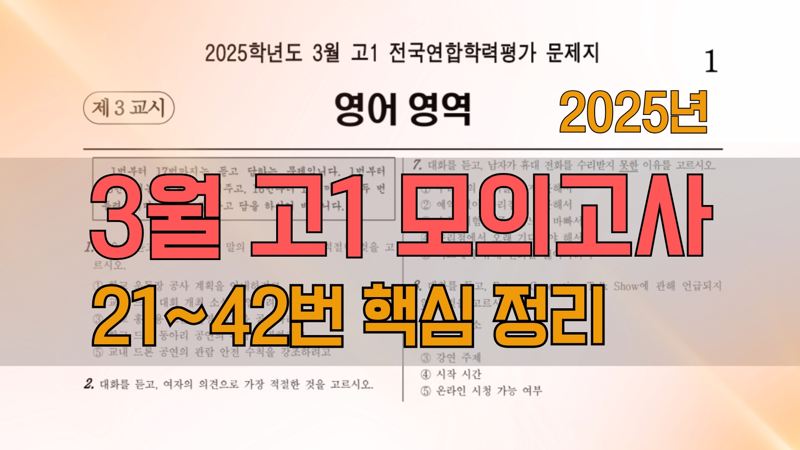 고1 2025년 3월 영어 모의고사 I 1학기 중간고사 I 핵심 문제 (21-42번), 핵심 문장 I 무료 PDF파일 다운로드 I #고1 2025년 3월 영어모의평가 #고1 3월 영어모의고사 분석 #2025.3 고1 모고 내신대비 #2025.3월모평영어해설 #3월모의고사 #2025.3 고1 영어 #고1 3월 모고 무료 다운로드 PDF 다운로드: https://drive.google.com/file/d/1BXVa6GEHBWeDNeenM9a_j2JWtyMg6lvU/view?usp=sharing 고1 2025년 3월 영어 모의고사에 출제된 21-42번 문항의 핵심 부분만 골라 정리했어요 변형문제를 풀기 전에 훑어봐야 할 내용들이니 꼭 살펴보세요. .............................................................................................................. 블루오션 유튜브 2025.06.11