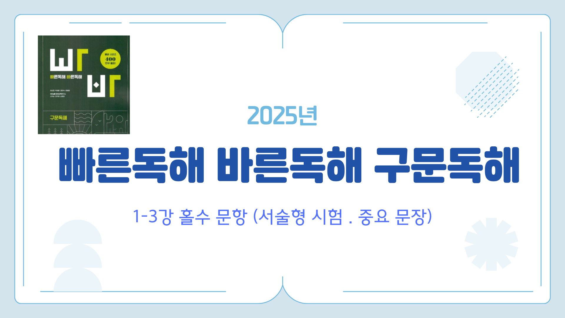 빠른독해 바른독해 구문독해 (1-3강 홀수 문항) / 서술형 필수 문장 #빠른독해 바른독해 구문독해 #빠바 구문독해 #빠른독해 바른독해 #영어독해 기본 2025년 내신 대비 개정판, 빠른독해 바른독해 구문독해 01 문장의 머리를 찾아라 02 동사는 문장의 틀을 결정한다 03 형태와 위치가 다양한 목적어를 정복하라 서술형 시험 대비, 01-03 홀수 문항만 정리해드립니다 https://youtu.be/eIHqvm2vTEQ 블루오션 유튜브 2025.06.11