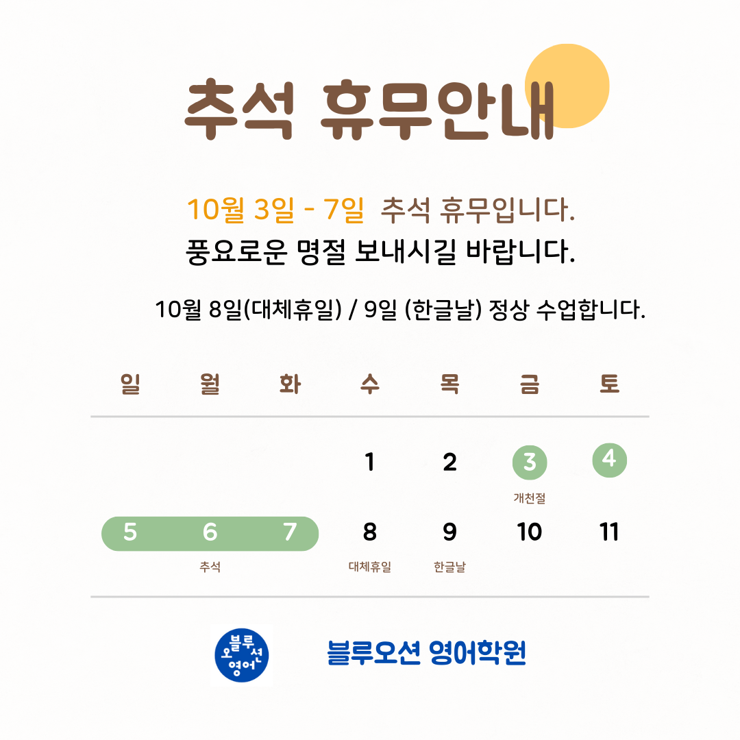 블루오션 예비고 집중수업 예비고(중3) 학생들을 위한 특강 집중수업을 소개합니다 기간: 2025.12.1 ~ 2026.2.13 총 11주개강: 2025.12.1 영어교육상담 2025.11.14